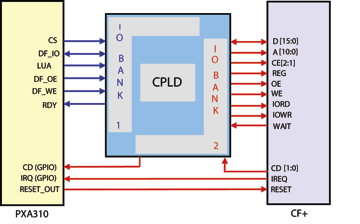 In Figure 6, a CPLD is used to bridge between two different parallel interfaces. This design example implements a PXA310 host processor bus interface to a Compact FLASH+ device. It can be implemented in a CPLD using approximately 17% of available logic and 59 I/O pins.