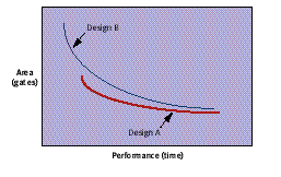 For a single design, the total variance is in the range of 10 to 25 percent of the area. The amount of change varies as a function of the optimization processes. If the design is optimized globally, it will vary about 20 percent in area and 10 percent in speed; if it's optimized on a critical path basis, its area will change about 10 percent, while its speed can range as much as 30 percent. If too many variables are constricted, the range of variation will be very small, since the synthesis will be starting near the high-performance end of the range. In today's design methodologies, only 30 to 80 percent of a design is synthesized. That the entire design isn't synthesized makes the gate estimation process more critical, because the range of variation is reduced even more. If the designer finds that the area/performance curve doesn't achieve the desired results, he or she will start to change the architecture and perhaps some of the constraints. Typically, that occurs in those cases more concerned with performance than area, First, they make a few iterations on Design A until the design seems to come to its limits. Then they change the design by adding resources and pipeline stages to get the desired performance (Design B), thus moving to new curve. |
