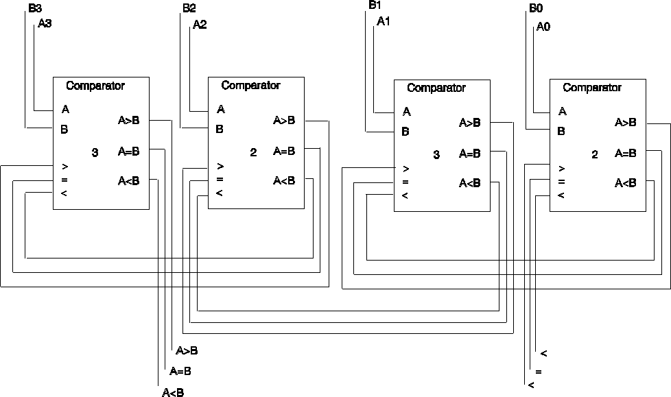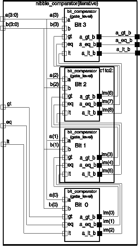 least: bit_comparator PORT MAP (a(i), b(i), gt, eq, lt, im(0), im(1), im(2) );