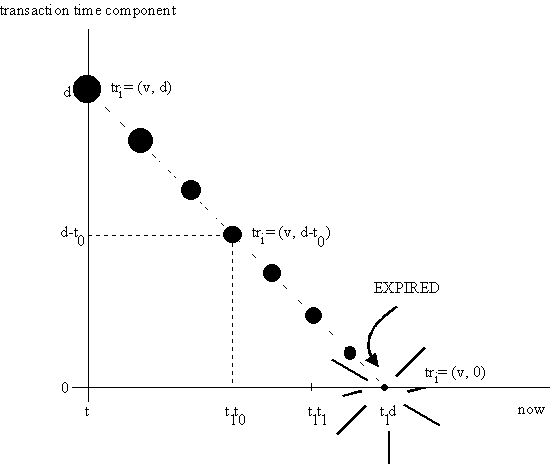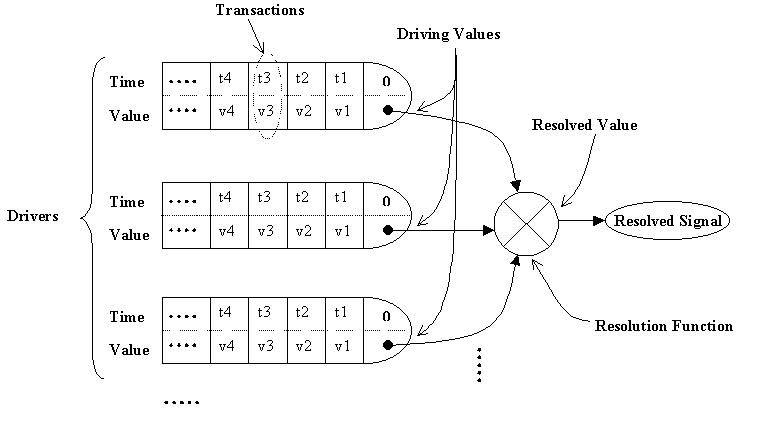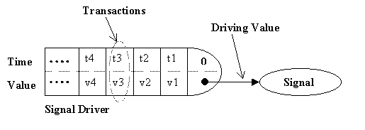 Events and transaction that occur on signals in Figure 4.16, (a) The resulting timing diagram showing transactions when they become current, (b) Transactions when they are placed on signals, (c) Transactions as their time values approach zero to become current, (d) Transactions from creation to expiration.