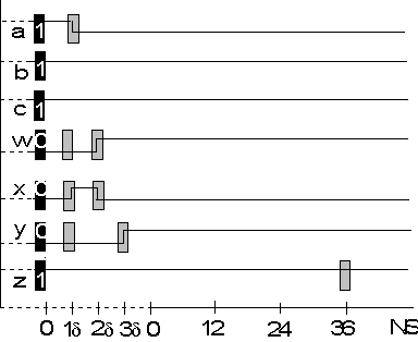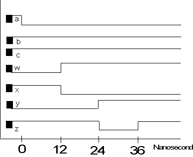 Timing diagram resulting from input a of circuit of Figure 4.5 changing from ‘1’ to ‘0’ at time zero.