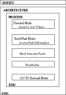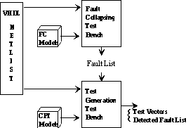 Before repeating the process of initializing the CPT models and applying a new test vector, the test controller checks for a target fault coverage. If this is satisfied, the test process terminates. At this time the list of undetected faults is extracted from the fault linked list and reported to an output file. An example of this file is shown in Figure 2. Other information such as the number of accomplished fault coverage are also reported to this output file. If the test process is not to terminate, the PRPG clock is activated for it to generate another random test data. Reaching a given fault coverage or exhausting all random test data are two reasons for the test process to terminate. 5. Conclusion We have shown vhdl models for fault collapsing and the use of such models for psuedo random test generation. The emphasis here was on the CPT method and its implemntation. More work is being done on the psudo random test generation and will be reported in a later paper. This work is part of an on-going research on VHDL modeling strategies for test related applications and environments utilizing such models. In this work gate models for tasks such as test generation, fault collapsing, and fault simulation are being developed. REFERENCES: