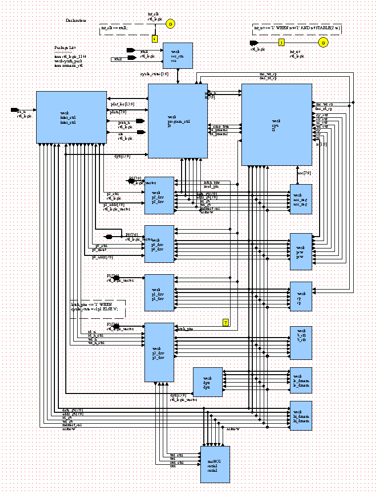 build -- script to build the components of system latch373.vhd -- 8 D-LATCHES max232.vhd -- Nothing yet mc8051.vhd -- The model of the 8051 MicroController (requires uart.vhd) nvsram.vhd -- SRAM that will only read from hex files pack8051.vhd -- Supporting package for mc8051.vhd quickhdl.ini -- Link to ini file system.vhd -- Toplevel VHDL Structural model of a system containing -- 8051, ram, 373 latches, and clock process. tb.vhd -- Old Testbench of mc8051.vhd using pwmodulator