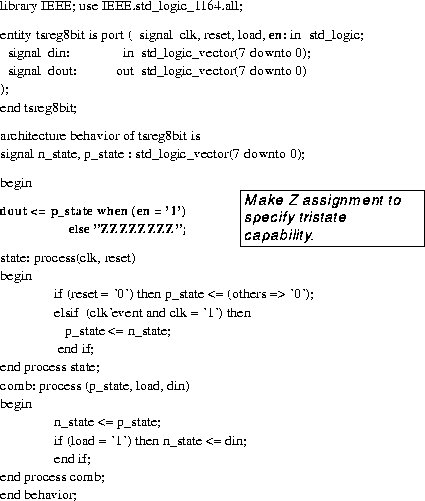 - The state process defines a storage element which is 8-bits wide, rising edge triggered, and