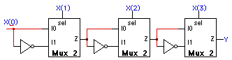 The inverted X with the multiplexor at each stage is equivalent to XOR. We then balance the XOR gates as shown below to minimize the worst case input-output delay for the circuit.