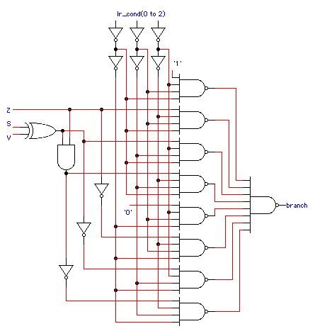With IR_cond select branch <= '1' when uncond , Z when zero , S xor V when less , (S xor V) and Z when lteq , '0' when never , not Z when nzro , not(S xor V) when gteq , not(S xor V) and Z when grtr ;