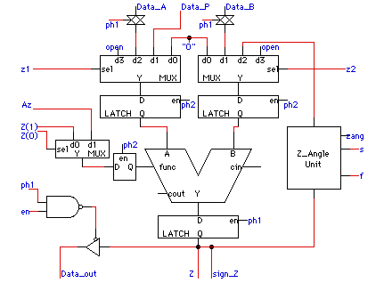 entity Z_Adder is port ( Data_A : in integer_32; Data_B : in integer_32; Data_P : in integer_32; Z : out integer; Data_out : out integer_32; sign_Z, s : out bit; z1, z2 : in bit_vector (0 to 1); Z_op, zang : in bit_vector (0 to 1); f, Az, en : in bit; ph_1, ph_2 : in bit ); -- integer_32 is declared elsewhere to be a bit_vector ( 0 to 31). -- Note that letting Z simply be type integer suggests that the -- synthesis tool should produce a bit_vector capable of -- displaying the full range of integers, i.e. 32 bits. This is, -- in fact, just what was wanted. end Z_Adder; architecture Concurrent of Z_Adder is signal A_in, B_in : integer; signal Z1_in, Z2_in : integer; signal Zsum, Zang_out : integer; signal GND, open_src : integer := 0; signal Zc, Zc_in : bit; -- again, we would synthesize 32 bit buses for everything -- declared "integer." begin -- transmission gates from Data Buses A_in <= Data_A when ph_1 = '1' else A_in; B_in <= Data_B when ph_1 = '1' else B_in; -- Leaving out the else clauses here would be more efficient from -- a simulation point of view, but it makes explicit what the -- synthesis tool has to generate i.e., a memoried element. In -- some tools this would lead to a redundant feedback from Q -- back to D. -- z2, z1, and Z_op are control signals from -- IKS controller selecting one of 9 functions -- to be implemented in the Z_adder. with z1 select Z1_in <= GND when "00", Data_P when "01", A_in when "10", open_src when "11"; with z2 select Z2_in <= GND when "00", B_in when "01", Zang_out when "10", open_src when "11"; with Z_op(0) select Zc_in <= Z_op(1) when '0', Az when '1'; -- All three WITH statements produce the multiplexors we want. -- Use of block to show design partition. -- These are the ph_2 enabled latches shown in the figure above. -- Note that synthesis tools like to have latches driven from a -- common enabling signal or clock in the same block. It makes -- for a cleaner model, too. Adder_blk: block signal ZA, ZB, Zout : integer; begin Zc <= Zc_in when ph_2 = '1' else Zc; ZA <= Z1_in when ph_2 = '1' else ZA; ZB <= Z2_in when ph_2 = '1' else ZB; -- Concurrent procedure call to CL_Adder, probably a high level -- model. Phase 1 enables latching the Zsum output. CL_Adder (Z1_in, Z2_in, Zout, Zc); Zsum <= Zout when ph_1='1' else Zsum; end block Adder_blk; -- Z is an output signal, but Zsum can be used -- internally. Z <= Zsum; -- Another concurrent procedure call. Complex -- function determining quadrant of angular -- computations. Compute_Angle ( Zsum, Zang_out, Zang, f, ph_1, s); -- Data_out is driving a bus that may be driven by other units. -- Guarded signal assignment is used here to provide tristate-like -- checking and driving of the bus. Tristate: block ((en = '1') and (ph_1='1')) begin Data_out <= guarded Zsum; end block Tristate; sign_Z <= transport '1' when zsum < 0 else '0'; end Concurrent;