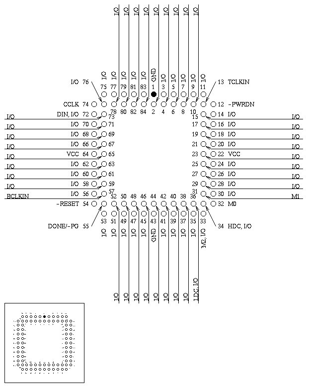 A Xilinx FPGA is physically a square matrix of CLBs (combinational logic blocks) surrounded by IOBs (input/output blocks), all interconnected by fusible switch networks. Most of the pins of the FPGA are tied to the user-programmable IOB outputs while the rest are used for power, ground, configuration, and clocking. The XC3000 series pin diagram shows that as many as 70 pins can be used for input and output by your design.