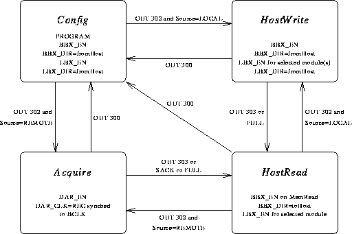 The Bullwinkle control GALs use a state machine which is shown in Figure 4.4. The modes HostWrite and Acquire cause identical action by Boris, that is, writing data into the SRAM until a Full condition or Stall Request. However, by alternating the Output Enable lines of the LBX and the DAR, the source of the data can either be the ribbon cable connection to Rocky ( Acquire mode) or from 16-bit writes by the host machine to the shared memory area ( HostWrite mode).