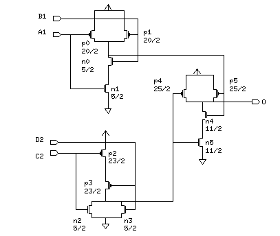 -------------------------------------------- Name X_loc Y_loc Capacitance (fF) lambda lambda 2U 1.2U 0.8U -------------------------------------------- A1 6.5 23.5 66.1 31.8 22.7 B1 16 23.5 61.6 30.2 21.9 C2 58 21 68.8 33.9 25.1 D2 77 21 67.2 33.3 24.5 O 46 25.5 - - - --------------------------------------------