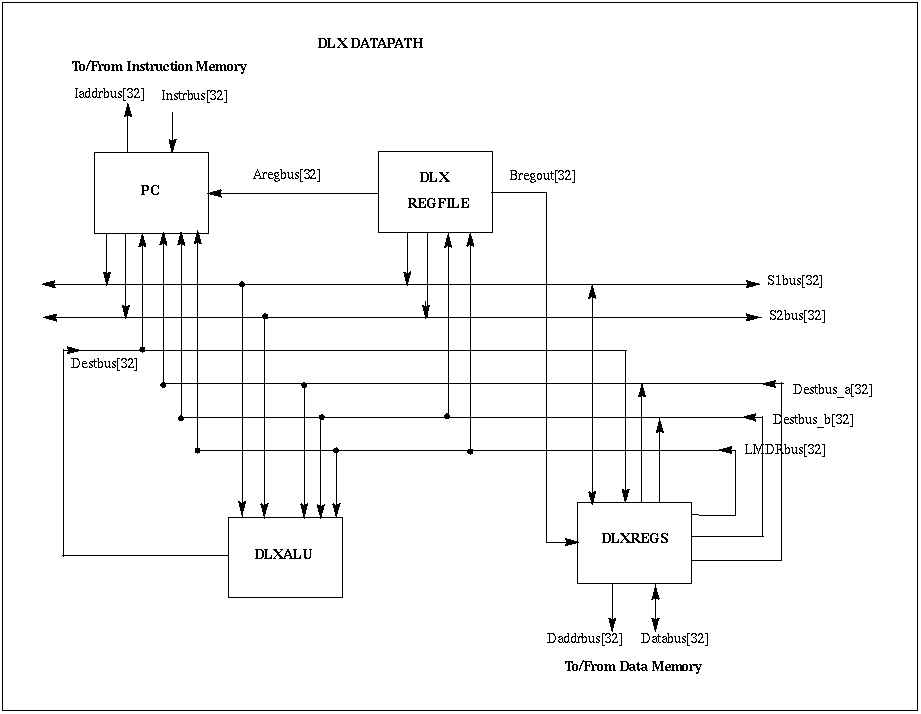 This page documents a DLX implementation done by the Microsystems Prototyping Laboratory(MPL) housed at the MSU Engineering Research Center. The implementation was used as a design driver to help validate the MPL SCMOS and GCMOS standard cell libraries . We make no claims as to the quality of this implementation. The implementation has been tested via an extracted transistor-level netlist simulation; pictures of sample layouts can be seen here . No layouts have been fabricated. Our implementation differs somewhat from the implementations found in the Hennessey and Patterson Computer Architecture textbooks. One major change is that we changed the encoding of the shift instructions so that the immediate value is stored in the same field as immediates for other instructions; we also added some interrupt capabilities. Because of this, the distribution includes a modified version of dlxsim which is used to produce the object code file read by the VHDL simulation. This implementation was actually done several years ago in the Mentor/GDT 'M' modeling language when the first H&P textbook appeared ( A Quantitative Approach ). In fall 1996, the M language implementation was converted to VHDL. As such, the signal names and block diagram structure do not match the implementation structure found in the newer H&P textbook ( The Hardware/Software Interface , which documents a MIPS implementation). Our implementation's control structure could definitely be further streamlined and improved. This implementation has served its purpose, however, in providing a non-trivial test case for our standard cell libraries.