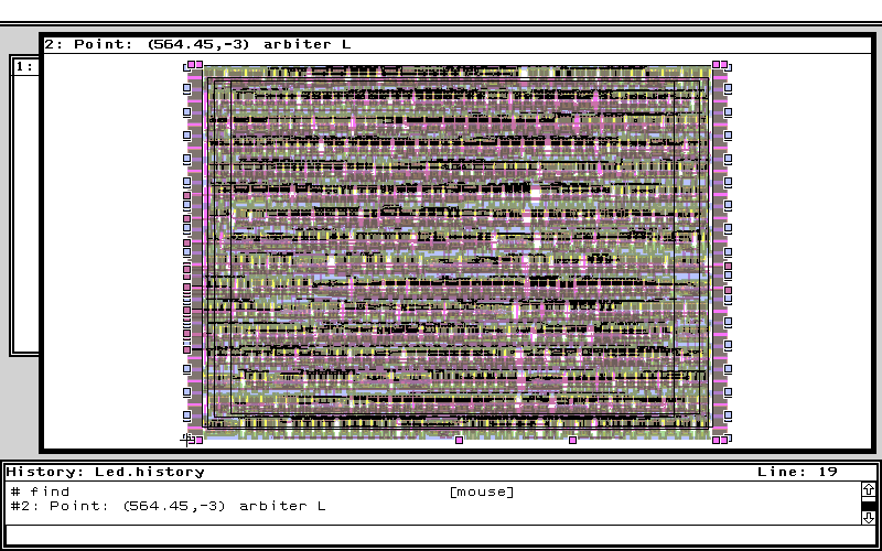 a file called 'arbiter.L'. A view of this layout in the Mentor Led