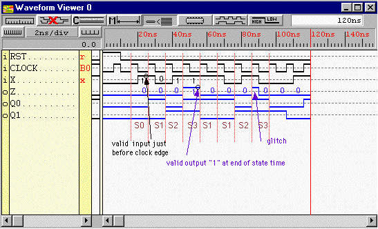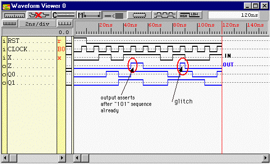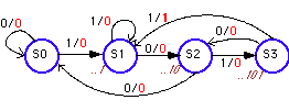 This example indicates that one has to be very careful with the timing when using a Mealy machine. Outputs can show glitches and are only valid at the end of a state time (i.e. just before the the positive clock edge for a positive edge triggered flip-flop or just before the negative clock transition for a negative egde triggered flip-flop). On the other hand a Mealy machine can often be implemented with fewer states that a Moore machine as can be seen from the Moore example. An alternative way to prevent glitches and to make the ouput of a Mealy machine synchronous with the clock, it to use a synchronous Mealy machine. The implementation of the sequence detector as a synchronous Mealy machine is given in the next example.