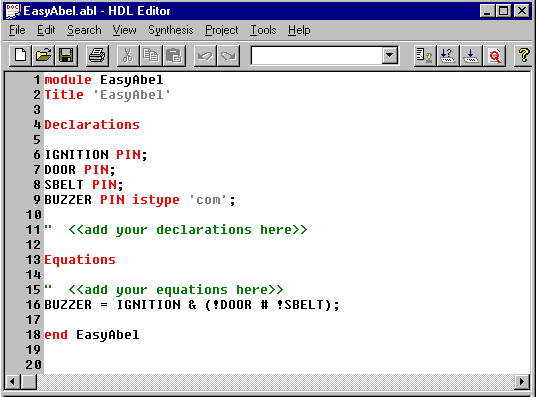 BUZZER = IGNITION & (!DOOR # !SBELT);Remember that the names are case sensitive. Figure 2 shows the completed ABEL source file. You can locate the pin numbers in the ABEL code or you can specify them later in a "User Constraint file" when you compile the design (see Constraint Editor in the Implemenation Section).