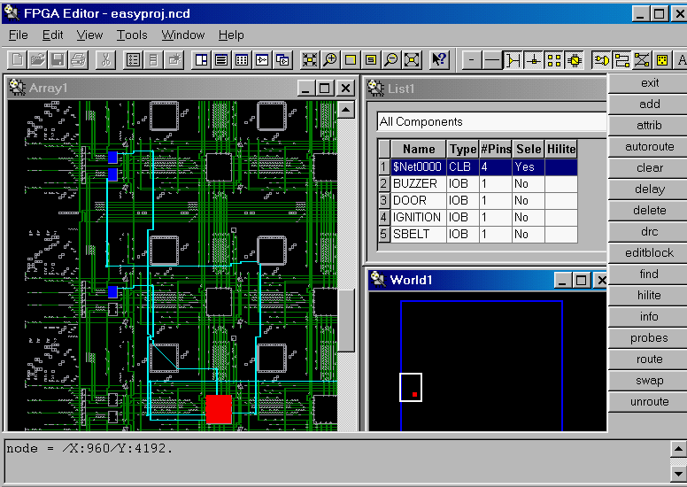 To look at a particular block on the FPGA, you can zoom in by clicking on the maginifying glass on the top toolbar. The bottom left window, labeled World shows a red dot that correspond to the signal that you selected in the List window on top. By moving the white rectangle and placing it on top of the desired signal (red dot) you can zoom into the specific block in the left window, shown as a red rectangle. You can now double click on the red block in the left window to see more details of the selected component.