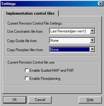 If you want to create a new version or new revision, go to the Project Manager. Select PROJECT -> CREATE VERSION or CREATE REVISION. This will bring up the Create Version or the Create Revision window. These windows look similar to the Implement window discussed earlier. You can specify which constraint file to use by clicking on the SET button next to Control File. Use the pull down menu to select a contraint file from a previous version/revision, as shown in Figure 8. If you do not specify a constraint file it will use the constraint file of the last revision. The versions will appear in the left hand window pane of the Project manager, under the Version tab. Once a new version or revision has been created you can run the implemenation program.