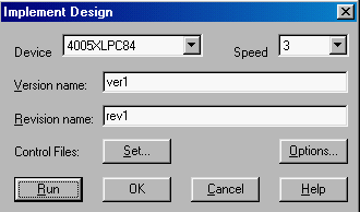 Go back to the Project Flowchart in the Project Manager window. If this is the first time you implement the design, click on the Implementation icon in the flow section of the Project Manager window. This will open the Implement Design window, shown in Fig. 2 below. If you have implemented earlier an earlier version and would like to create a new revision or new version, go to the PROJECT -> CREATE REVISION or CREATE VERSION menu. This will open the Create Revision or Version window, similar to the Implement Design window shown in Fig. 2. The Implement Design Window lets you specify the target device and speed grade. In case you get a message saying "Schematic Netlist is older than the Schematic. Update netlist from Schematic Editor?", click the YES button. The target device is already specified as 4005XLPC84 as this is the one we selected when the project was created. If needed, you can change the target device. The Revision and Version name is automatically filled in with rev1 and ver1. You can change the name if you want to. The implementation options allow you to specify how the design is optimized, mapped, placed, routed and configured. In general, the default settings should be good enough for introductory lab exercises. When you click on the SET button, the Settings dialog box will open. This allows you to specify control files such as a specific Constraint, Guide or Floorplan files. The default settings are usually fine. In case you are using the HDL Flow mode for your project, the Implementation Settings window will open. Click on the RUN button to start the implementation process.