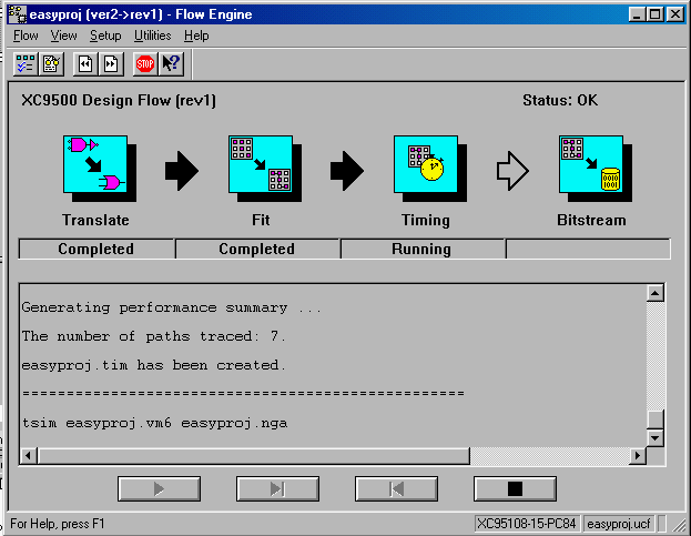 Figure 5: Flow Engine window for a CPLD device. (Screen clip from Xilinx (TM) Foundation software)
