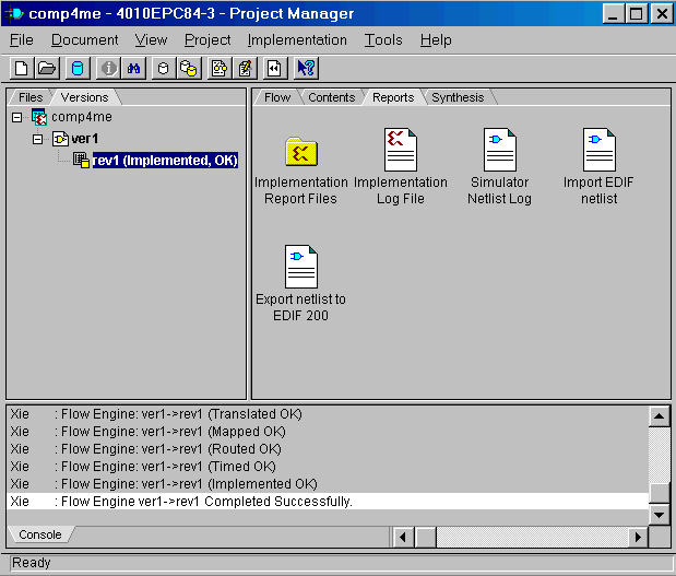 When the implementation is complete a small window will pop up informing you that the Flow Engine is Completed Successfully. Click OK. In case errors occurred you should refer to Implementation Log file, in the Project Manager (click on the Reports tap on top of the right window pane), as shown in Figure 4 below. In the hierarchy browser (left pane window) of the Project Manager, click on the Versions tab and you will see the status of the implementation.