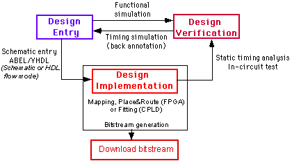 The implementation tools fit the entered design into the target device architecture. The tools compile a design file into a configuration file that is optimized in terms of use of logic gates and interconnections for the targeted device. Downloading of the bitstream can be done easily from a PC into a FPGA (using the Xilinx demoboard, the XS40 or XSV boards) or into a CPLD (on the XS95 board). Both devices can also be programmed in-the-system (ISP) by connecting a JTAG or XChecker cable to the device's programming pins.