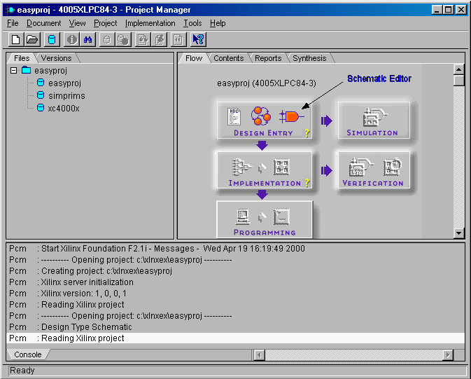 Figure 3: Xilinx Foundation Project Manager window (Schematic Design Entry) (Screen clip from Xilinx (TM) Foundation software)The project will have a .PDF extension. Other project files such as schematics, netlists, macros, etc., will be stored in a subdirectory with the project name. A project can have only one top schematic (or HDL source file). Sub-schematics can be added to the project as macros.