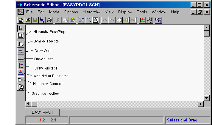 Go to the FILE menu -> SAVE or click the floppy disk icon on the top toolbar. Give your schematic a name with the extension .SCH (ex. EASYPROJ.sch). When finished with the schematic, exit the Schematic capture program which will bring you back to the Foundation Program Manager window (Figure 3.3).