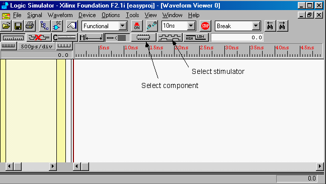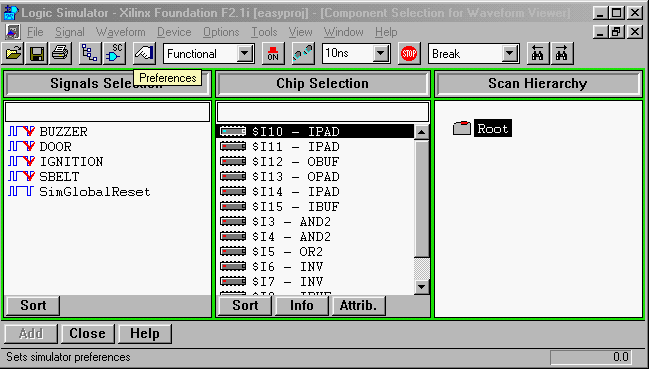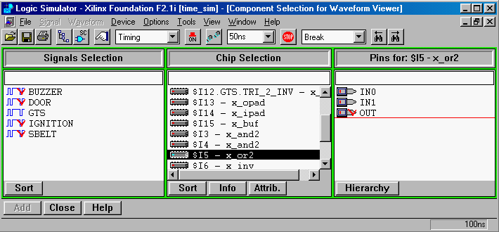 In the Component Selection window, select the inputs you want to add to the waveform viewer and click the "Add" button or double click the signal name. Do this for all inputs and outputs. When done, click on the CLOSE button. The selected signals will appear in the Waveform Viewer window.Figure 2: Component Selection windows (Screen clip from Xilinx (TM) Foundation software)