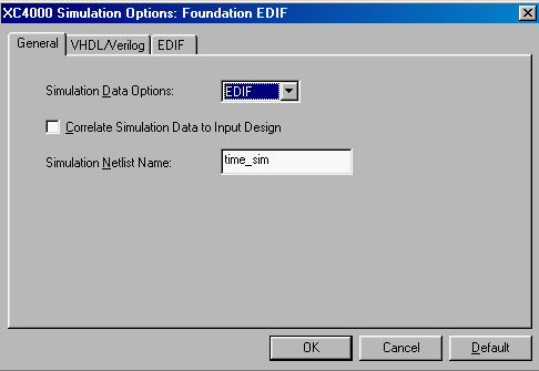 1. In the Program Manager window, select IMPLEMENTATION -> OPTIONS. In the Options window, click on the Edit Options button for the Simulations Option (Foundation EDIF). In the Simulation Options window, click on the General Tab and De-select the option: Correlate Simulation Data to Input Design as shown in the figure below.