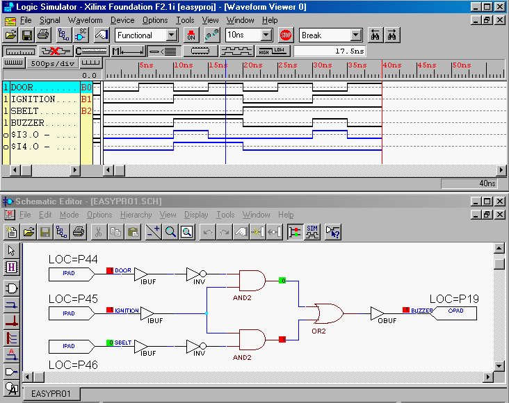 Figure 5: Results of the simulation shown in the Simulator and Schematic windows.(Screen clip from Xilinx (TM) Foundation software)