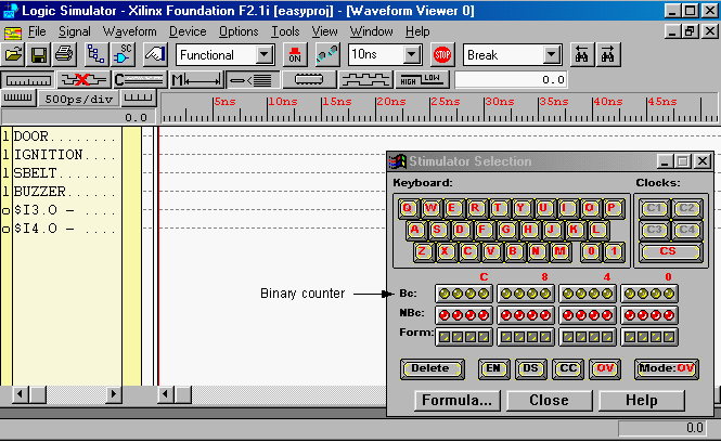Figure 4: Stimulator window and Simulation window (Screen clip from Xilinx (TM) Foundation software)In our case we need to use only three outputs of the counter. We will use the lower three bits of the Bc counter. Click on the signal name in the Waveform viewer first (Ex. DOOR) so that it is highlighted, then click on the most right side counter output (labeled 0). The name B0 will appear after the signal name in the Waveform Viewer. Do the same for the other three input signals (select the next two counter outputs B1 and B2, respectively).