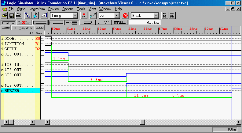 Figure 9: Timing simulation showing the delay associated with each logic