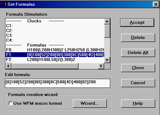 We mentioned that the 3rd row of LEDs in the Stimulator Selection Window is used to assign user-defined values (or formulas) to a signal. Formulas can be used to assign values to a single signal or a bus. This is done by clicking on the Formula button in the Stimulator Selection window. This will bring up the Set Formulas window, shown in Figure 7.