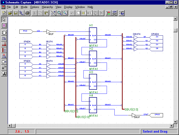 - You can check that the MYFA symbol indeed represents your full adder circuit. Click on the H (Hierarchy icon on the left toolbar) and then double click on the MYFA symbol. The schematic of the full adder will appear. Go back to the top schematic MY4ADD.SCH