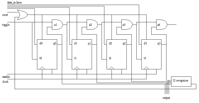Below is a logic diagram for the binary counter. The commented Verilog description of the counter can be found here