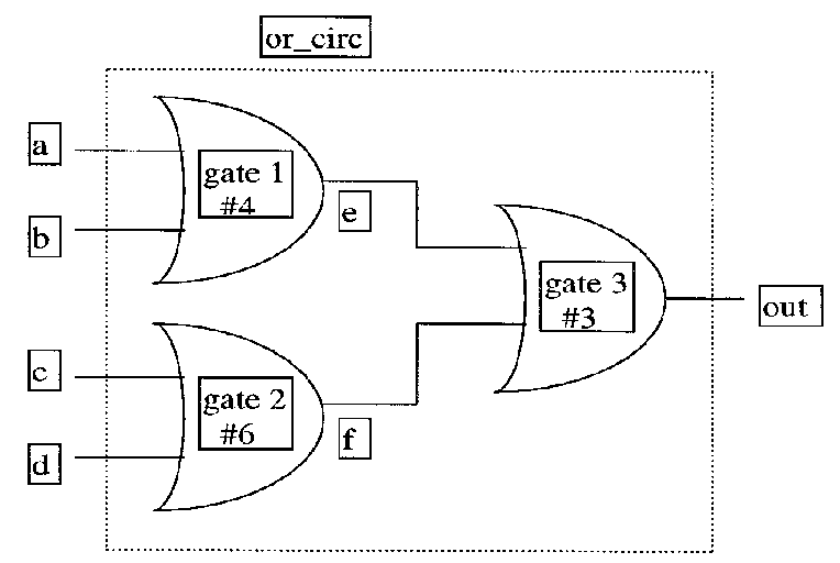 The above or_circ modules results in delays of (4+3) = 7 and (6+3) = 9 for the 4 connections part from the input to the output of the circuit.