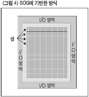´Ù½Ã ¸»ÇØ ÁÖ¾îÁø ¾î·¹ÀÌ¿¡¼ ¸ðµç ¼¿µéÀÌ »ç¿ëµÇµç ±×·¸Áö ¾Êµç ¸ðµÎ ¼³Ä¡µÅ ÀÖ¾î¾ß ÇÑ´Ù´Â °ÍÀÌ ´ÜÁ¡À¸·Î ÁöÀûµÈ´Ù. °ÔÀÌÆ® ¾î·¹ÀÌ¿¡ ±â¹ÝÇÑ ¹æ½ÄÀÌ <±×¸² 3>¿¡ ³ªÅ¸³ª ÀÖ´Ù. ¶ÇÇÑ °ÔÀÌÆ® ¾î·¹ÀÌ ¹æ½ÄÀ» µû¸£¸é¼ ÀÌ¿¡ ´ëÇÑ ¼¼ºÎÀûÀΠƯ¼ö ÇüÅ·ΠSOG(Sea of Gate) ÇüÅÂÀÇ Ä¨ÀÌ ÀÖ´Ù. ÀÌ ¹æ½ÄÀº <±×¸² 4>¿¡¼µµ º¸´Â ¹Ù¿Í °°ÀÌ ¼¿À» ¿¬°áÇϱâ À§ÇÑ º°µµÀÇ ¹è¼± ¿µ¿ªÀ» ¾ø¾Ø ÇüÅÂÀÌ´Ù.