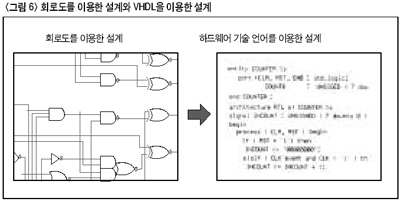 <±×¸² 6>¿¡¼ ¿ÞÂÊÀÇ ±×¸²Àº ÀÏ¹Ý È¸·Îµµ¸¦ ÀÌ¿ëÇØ Çϵå¿þ¾î ¸ðµâÀ» µðÀÚÀÎÇÏ´Â ¿¹¸¦ ³ªÅ¸³½´Ù. ÀÌ¿¡ ¹ÝÇØ ¿ìÃøÀº Çϵå¿þ¾î ±â¼ú ¾ð¾î¸¦ ÀÌ¿ëÇÑ ¼³°è ¹æ¹ýÀ» ³ªÅ¸³½´Ù. Çϵå¿þ¾î ±â¼ú ¾ð¾î¸¦ ÀÌ¿ëÇÑ ¼³°è ¹æ¹ýÀº ´Ù¾çÇÑ ºÐ¾ß¿¡ ÀÌ¿ëµÉ ¼ö ÀÖ´Ù´Â Á¡¿¡¼ ÀåÁ¡ÀÌ µÇ±âµµ ÇÑ´Ù. ÀÌ´Â ASIC »Ó¸¸ ¾Æ´Ï¶ó CPLD/FPGA¿¡ ±¤¹üÀ§ÇÏ°Ô ÀÌ¿ëÇÒ ¼ö ÀÖÀ¸¸ç ¶ÇÇÑ »ó´ëÀûÀ¸·Î °£´ÜÇÑ ¼Ò±Ô¸ð ȸ·ÎÀÇ µðÀÚÀο¡µµ ÀüÇô ¹«¸® ¾øÀÌ »ç¿ëÇÒ ¼ö ÀÖ´Ù. ȸ·Îµµ¸¦ ÀÌ¿ëÇÑ ¼³°è ¹æ¹ý°ú Çϵå¿þ¾î ±â¼ú ¾ð¾î¸¦ ÀÌ¿ëÇÑ ¼³°è ¹æ¹ýÀ» <Ç¥ 2>¿¡ ºñ±³ÇØ ³õ¾Ò´Ù.