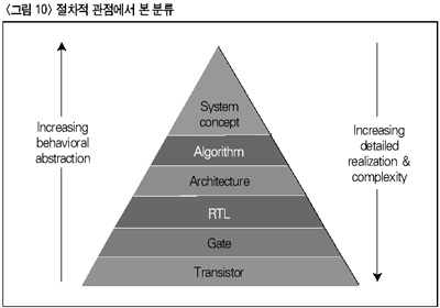 <±×¸² 9>¿¡¼ º¸µíÀÌ Ãß»óÈÀÇ ´Ü°è¿¡´Â Å©°Ô 5°èÃþÀÌ Á¸ÀçÇÑ´Ù. »ç½Ç»ó ÀÌÀÇ ºÐ·ù¿¡´Â ¸íÈ®ÇÑ ±âÁØÀÌ ÀÖ´Â °ÍÀº ¾Æ´Ï°í »ç½Ç ±× °æ°èµµ ¾Ö¸ÅÇÏ´Ù. ±×·¯³ª ÇöÀç ³Î¸® »ç¿ëµÇ°í ÀÖ´Â ¿ë¾îµéÀ̱⠶§¹®¿¡ °³³äÀûÀ¸·Î ÀÌÇØÇϱ⠹ٶõ´Ù. ½Ã½ºÅÛ ·¹º§Àº °¡Àå Ãß»óÈ Á¤µµ°¡ ³ôÀº ·¹º§ÀÌ´Ù. CPUÀÇ ÆÄÀÌÇÁ ¶óÀÎÀ̳ª ij½Ã µî ½Ã½ºÅÛ ³»ÀÇ ±â´ÉÀ» Ç¥ÇöÇÑ ·¹º§ÀÌ´Ù. ´ÙÀ½À¸·Î ¾Ë°í¸®Áò ·¹º§Àº µ¿ÀÛÀû ·¹º§À̶ó°íµµ Çϴµ¥ ¿©±â¼´Â ȸ·ÎÀÇ µ¿ÀÛÀ̳ª ¿òÁ÷ÀÓÀ» Ç¥ÇöÇÏ´Â ·¹º§ÀÌ´Ù. ȸ·Î¿¡¼ ºí·°À̶ó´Â °³³äÀº ÇöÀç ÀÌ ·¹º§¿¡¼´Â Á¸ÀçÇÏÁö ¾ÊÀ¸¸ç, ¾Õ¼ ¼³¸íÇÑ ÀýÂ÷Àû ¼³°è ´Ü°è¿¡ ÇØ´çÇÏ´Â ·¹º§ÀÌ´Ù.
