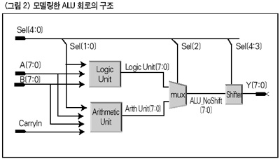 Á¶±Ý ´õ ±¸Ã¼ÈÇÏÀÚ. ¿ì¸®°¡ ¸ðµ¨¸µÇÒ ALU´Â ½ÇÁ¦ ½Ã½ºÅÛ¿¡¼ »ç¿ëµÇ´Â ALUº¸´Ù ¾î´À Á¤µµ Á¦¾àÀÌ ÀÖ±â´Â ÇÏ´Ù. ÇÏÁö¸¸ À̸¦ È®Àå½ÃŰ°í ³ª¸§´ë·ÎÀÇ ÃÖÀûÈ °úÁ¤À» °ÅÄ£ °ÍÀÌ »ó¿ëȵǾî ÀÖ´Â ALU¶ó°í ÇßÀ» ¶§ ¿ì¸®°¡ µðÀÚÀÎÇÏ°Ô µÉ ALU°¡ Çö½Ç°ú Å©°Ô µ¿¶³¾îÁø °Í¸¸Àº ¾Æ´Ï´Ù.