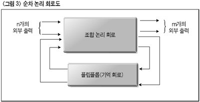 ´ÙÀ½À¸·Î ¾Ë¾ÆºÁ¾ß ÇÒ È¸·Î´Â ¼øÂ÷ ȸ·ÎÀÌ´Ù. ¼øÂ÷ ȸ·Î´Â ¹«¾ùº¸´Ùµµ ÀÌÀüÀÇ °ªÀ̳ª »óŸ¦ ±â¾ïÇÒ ¼ö ÀÖ´Ù´Â »ç½ÇÀÌ Á¶ÇÕ È¸·Î¿Í ºñ±³ÇßÀ» ¶§ °¡Àå Å« Â÷ÀÌÁ¡À̶ó ÇÒ ¼ö ÀÖ´Ù. Çø³Ç÷Ó(flip-flop)°ú Á¶ÇÕ ³í¸®È¸·Îµé·Î ±¸¼ºµÇ¸ç, Ãâ·ÂÀº ¿ÜºÎ ÀԷ°ú Çø³Ç÷ÓÀÇ ÇöÀç »óÅ¿¡ ÀÇÇØ °áÁ¤µÇ´Â ³í¸® ȸ·ÎÀÌ´Ù. ¿©±â¼ Çø³Ç÷ÓÀÌ ¹Ù·Î ±â¾ï ÀåÄ¡·Î¼ÀÇ ¿ªÇÒÀ» ÇÏ°Ô µÇ´Â °ÍÀÌ´Ù. <±×¸² 3>¿¡ ÀÌ·¯ÇÑ ¼øÂ÷ ȸ·ÎÀÇ ±âº» ±¸Á¶°¡ ³ªÅ¸³ª ÀÖ´Ù.