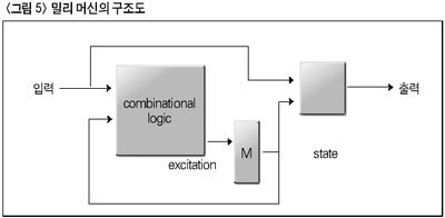 ¿ì¼± ¾Ë¾Æº¼ ½ºÅ×ÀÌÆ® ¸Ó½ÅÀº ¹Ð¸® ¸Ó½Å(mealy machine)ÀÌ´Ù. ÀÌ´Â <±×¸² 5>¿¡¼ ³ªÅ¸³ ¹Ù¿Í °°ÀÌ Ãâ·Â ÇÔ¼ö°¡ ´ÙÀ½ »óÅÂ¿Í ÇöÀçÀÇ ÀԷ¿¡ ÀÇÇØ¼ °áÁ¤µÇ´Â ±¸Á¶¸¦ ¸»ÇÑ´Ù. µû¶ó¼ ÀÔ·Â ½ÅÈ£ÀÇ Á¶°Ç¿¡ µû¶ó¼ ¿©·¯ °³ÀÇ Ãâ·Â ½ÅÈ£¸¦ °¡Áú ¼ö ÀÖÀ¸¸ç ºñ±³Àû ÀÚÀ¯µµ°¡ ³ôÀº »óŵµ¸¦ ±¸ÇöÇÒ ¼ö ÀÖ´Ù. ÇÏÁö¸¸ ¿ÜºÎ ÀÔ·ÂÀÌ Ãâ·Â ÇÔ¼ö¿¡ Á÷Á¢ Àü´ÞµÇ±â ¶§¹®¿¡ ÀԷ´ÜÀÇ ³ëÀÌÁî°¡ Ãâ·Â¿¡ ±×´ë·Î ¹Ý¿µµÉ ¼ö ÀÖ´Ù.