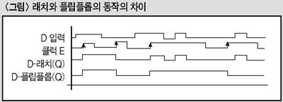 ¼øÂ÷ ȸ·Î¸¦ Á¢ÇÒ ¶§¸¶´Ù Ç×»ó µîÀåÇÏ´Â °ÍÀÌ ¹Ù·Î ·¡Ä¡¿Í Çø³Ç÷ÓÀÌ´Ù. ·¡Ä¡¿Í Çø³Ç÷ÓÀ̶õ µÎ °³ÀÇ ¾ÈÁ¤ »óŸ¦ °®´Â ÀÏÁ¾ÀÇ ±â¾ïȸ·Î¸¦ ¶æÇÑ´Ù. ÀÌ ¶§ ¸»ÇÏ´Â ¾ÈÁ¤ »óŶõ ȸ·ÎÀÇ ¿ÜºÎ·ÎºÎÅÍ ÀÔ·ÂÀ» °¡ÇÏÁö ¾Ê´Â ÇÑ º»·¡ÀÇ °ªÀ» À¯ÁöÇÒ ¼ö Àִ ȸ·ÎÀÇ »óŸ¦ ÀǹÌÇϸç ÈçÈ÷ µÎ °¡ÁöÀÇ ¾ÈÁ¤ »óŸ¦ ¸»ÇÒ °æ¿ì ÀÌÀü °ªÀ¸·Î 1 ȤÀº 0ÀÇ °ªÀ» ±â¾ïÇϰí ÀÖÀ» ¼ö ÀÖ´Ù´Â ÀǹÌÀÌ´Ù. ±×·³ ÀÌ µÑ »çÀÌ¿¡ Â÷ÀÌÁ¡Àº ¹«¾ùÀϱî. ¿ì¼± ·¡Ä¡ÀÇ °æ¿ì´Â ·¹º§ Æ®¸®°Å(level trigger)¿¡ ÀÇÇØ µ¿ÀÛÇÑ´Ù. µû¶ó¼ ·¡Ä¡´Â Ŭ·°ÀÌ 1(high)ÀÎ µ¿¾È ÀÔ·ÂÀÇ º¯È¸¦ ±×´ë·Î Ãâ·Â¿¡ ¹Ý¿µÇÑ´Ù. ÀÌ¿¡ ¹ÝÇØ Çø³Ç÷ÓÀº ¿¡Áö Æ®¸®°Å(edge trigger)¿¡ ÀÇÇØ µ¿ÀÛÇÑ´Ù. µû¶ó¼ Çø³Ç÷ÓÀº Ŭ·° ÆÞ½º°¡ ³ªÅ¸³ª±â ¹Ù·Î ÀÌÀüÀÇ ÀÔ·ÂÀÌ Ãâ·Â¿¡ ¹Ý¿µµÇ¾î ´ÙÀ½ Ŭ·° ÆÞ½º°¡ ³ªÅ¸³¯ ¶§±îÁö ±× »óŸ¦ À¯ÁöÇÔÀ» ÀǹÌÇÑ´Ù.