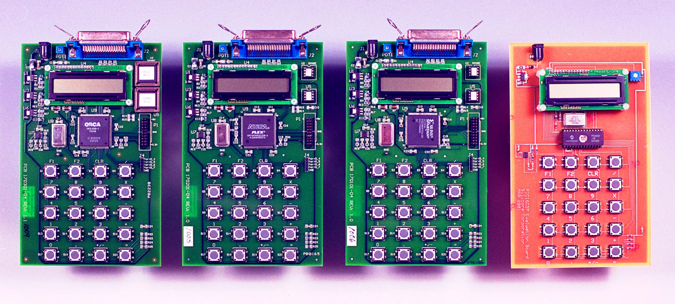 Testing Code Compatibility on the SLC1657 From left to right: Agere ORCA 3L, Altera FLEX 10KE, Xilinx Spartan 2 and Microchip PIC16C57.