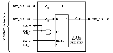 For example, Figure 13 shows a simple 8-bit parallel output port. The entire interface is implemented with a standard 8-bit 'D-type' flip-flop register (with synchronous reset) and a single AND gate. During write cycles, data is presented at the data input bus [DAT_I(7..0)], and is latched at the rising edge of [CLK_I] when [STB_I] and [WE_I] are both asserted.