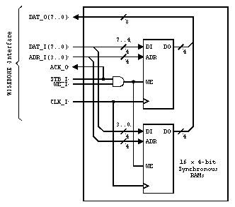 Figure 14. Simple 16 x 8-bit SLAVE memory. It can be seen from these two examples that the WISHBONE interface is very efficient in terms of logic gate count. It works in conjunction with standard logic primitives, and adds very few (if any) additional gates to the interface.