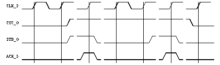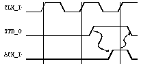 All WISHBONE bus cycles use a handshaking protocol between the MASTER and SLAVE interfaces. As shown in Figure 7, the MASTER asserts [STB_O] when it is ready to transfer data. [STB_O] remains asserted until the SLAVE asserts one of the cycle terminating signals [ACK_I], [ERR_I] or [RTY_I]. At every rising edge of [CLK_I] the terminating signal is sampled. If it is asserted, then [STB_O] is negated. Both sides of the interface can then completely control the rate at which data is transferred. If the SLAVE always operates at the maximum speed of the core, and if the [ERR_I] and [RTY_I] signals are not used, then the [ACK_O] signal may be asserted by the slave immediately after it receives [STB_I]. The interface will function normally under these circumstances.