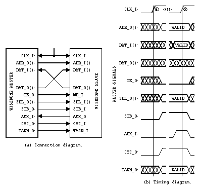 Figure 6. Simple MASTER / SLAVE example. Table 1 presents signal descriptions that can be used by the MASTER interface. The SLAVE has a similar set of signals that are not shown in Table 1. For a complete list of WISHBONE signals, the user is directed to the specification document.