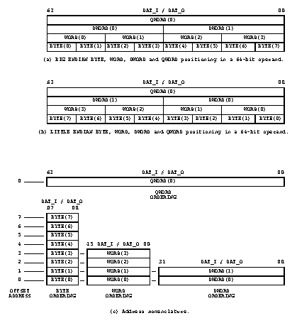 A BYTE(N), WORD(N), DWORD(N) and QWORD(N) nomenclature is used to define data ordering. These terms are defined in Table 2. The table also defines the granularity of the interface. Granularity is the minimum unit of data transfer that is supported by the interface. For example, the smallest operand that can be passed through a port with 16-bit granularity is a 16-bit WORD. In this case, an 8-bit operand cannot be transferred.