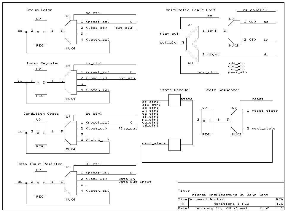 Micro8 started of as a minimal set 4 instruction computer By Tim Boscke designed to fit in a 32 Macrocell CPLD.