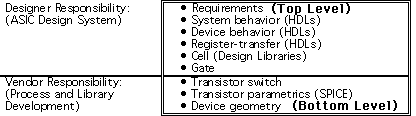 Ideally, design systems allow designers to design from the top level (requirements) to the bottom level (gate), assuming that the vendor's libraries have been previously modeled sufficiently at the levels below gate level. As ASIC technology matures, it is rapidly migrating toward this top-down approach.